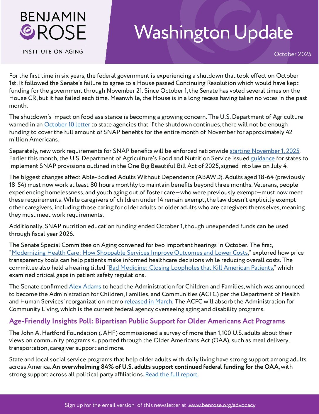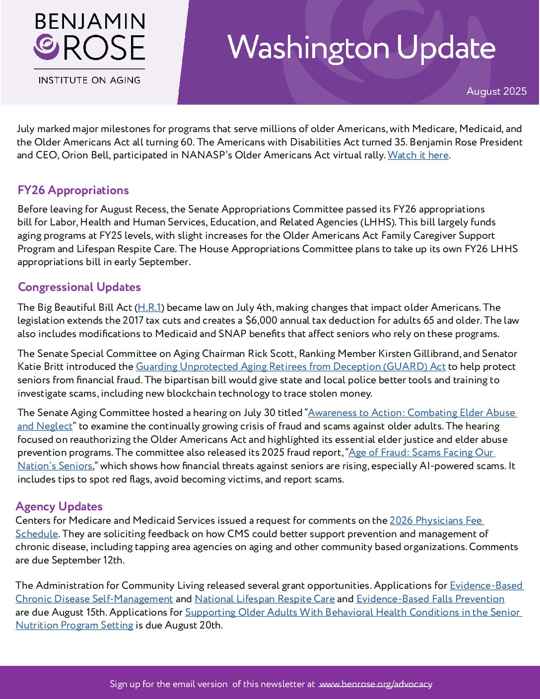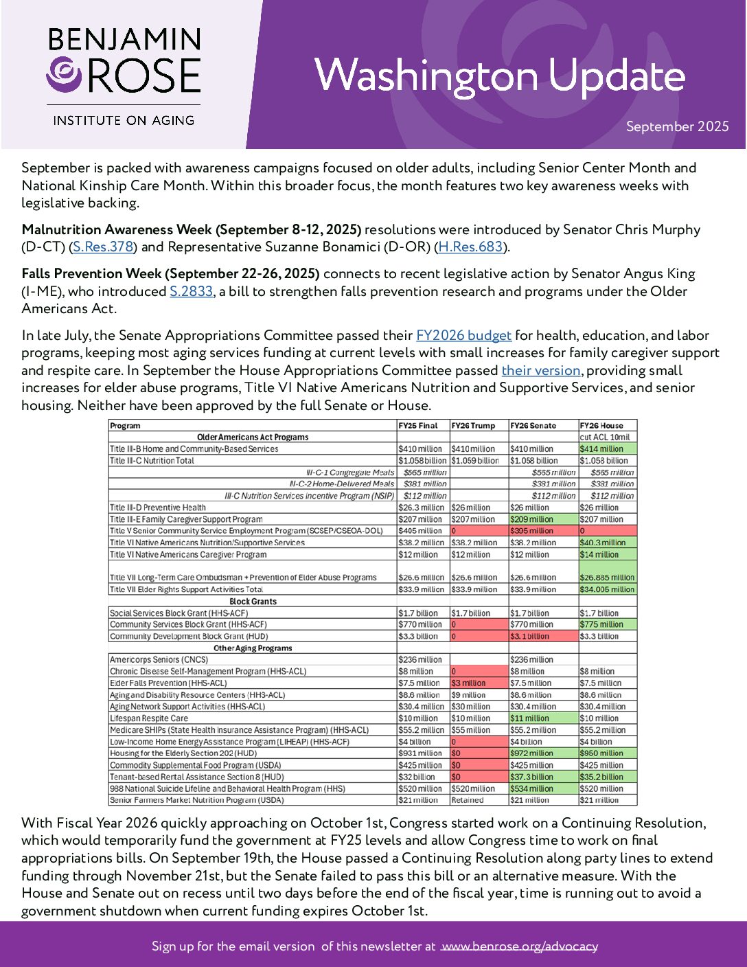 Benjamin Rose Institute on Aging is committed to staying engaged in, and sharing, the latest public policy news affecting older adults, caregivers and the professionals who care for them. The Washington Update is produced monthly with our partners at Matz, Blancato & Associates to share the latest information about policy issues impacting older adults and their families.